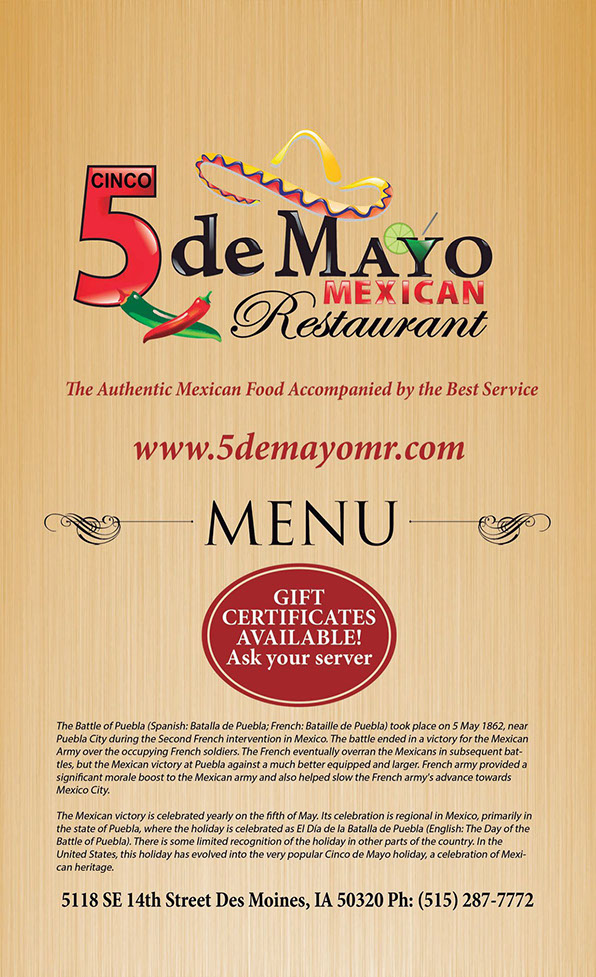 Family owned and operated, Cinco (5) de Mayo has been proudly serving the Des Moines area for years.
